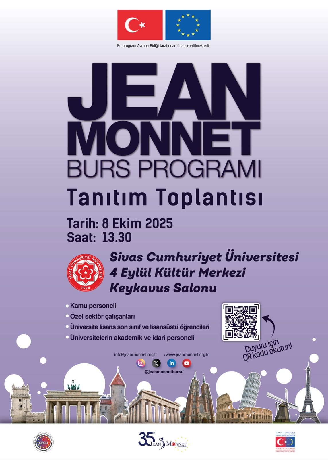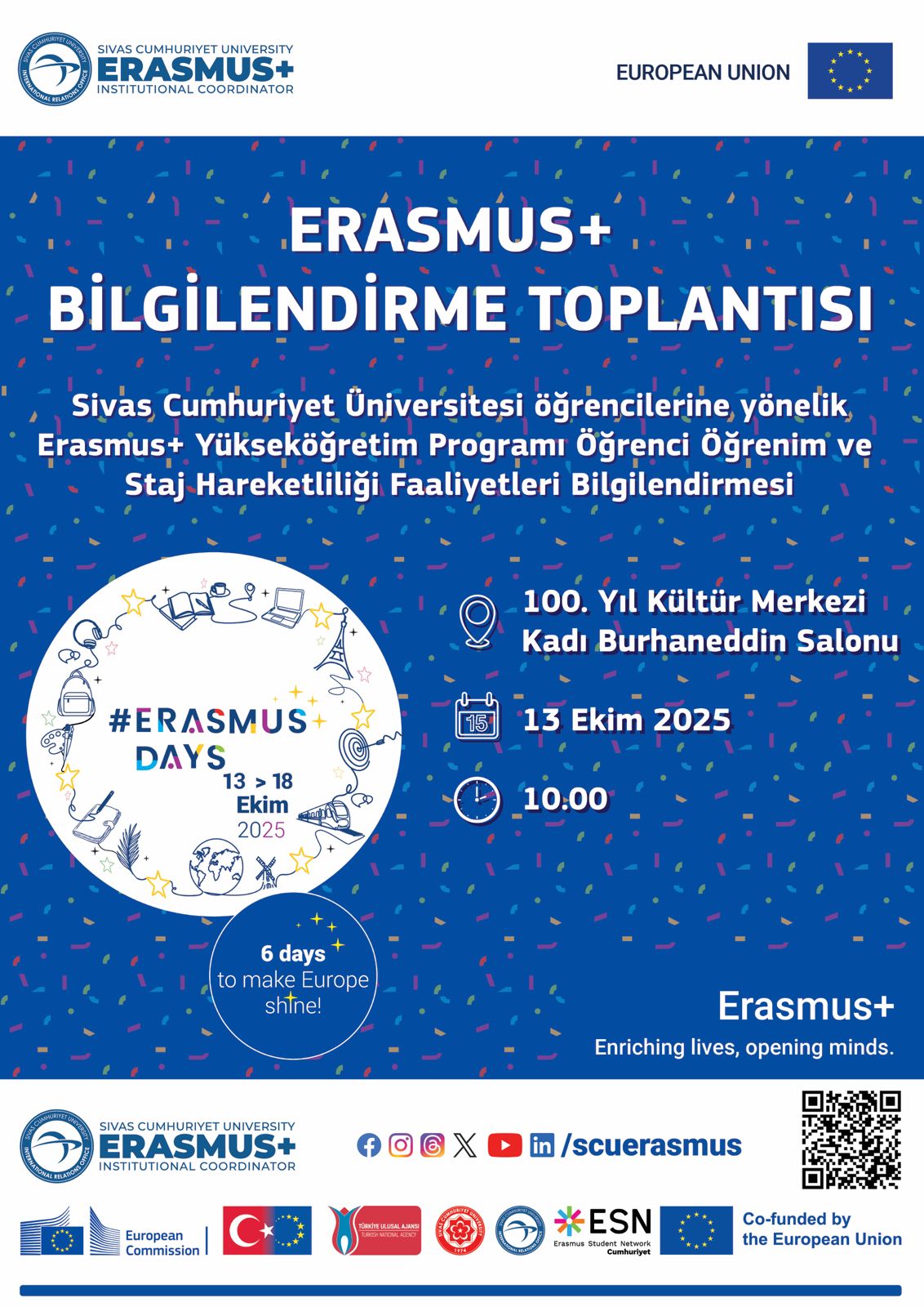 Sivas Cumhuriyet Üniversitesi öğrencilerine yönelik Erasmus-Yükseköğretim Programı Öğrenci Öğrenim ve Staj Hareketliliği Faaliyetleri kapsamında 13 Ekim 2025 tarihinde saat:10:00'da 100. Yıl Kültür Merkezi Kadı Burhanettin Salonunda Toplantı yapılacaktır.