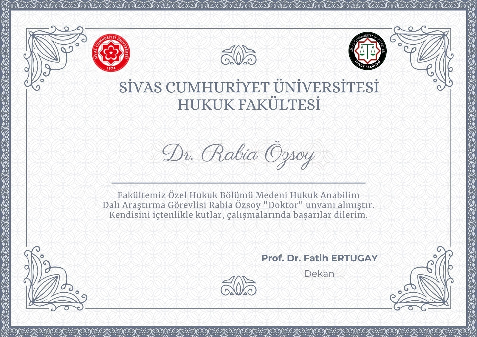 Fakültemiz Özel Hukuk Bölümü Medeni Hukuk Anabilim Dalı Arş.Gör.Dr. Rabia ÖZSOY doktor ünvanı almıştır.