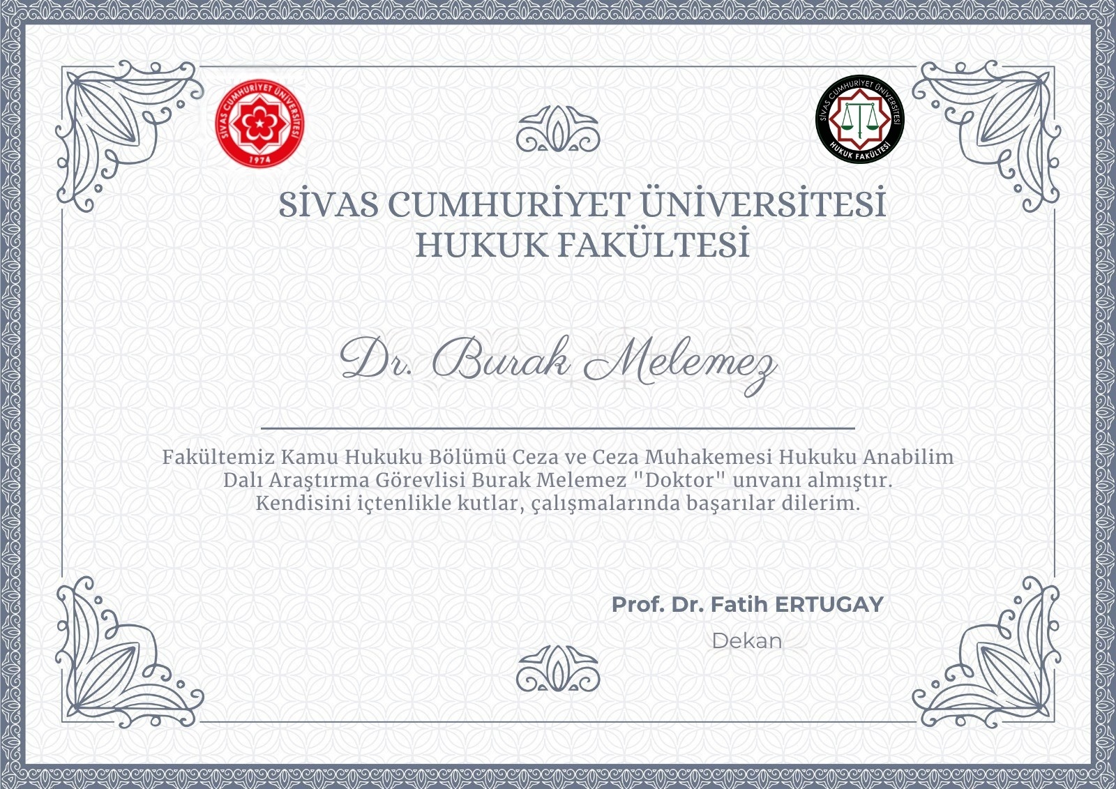 Fakültemiz Kamu Hukuku Bölümü Ceza ve Ceza Muhakemesi Hukuku Anabilim Dalı Arş.Gör.Dr.Burak MELEMEZ doktor ünvanı almıştır.